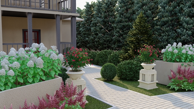 🌿 Использовали топиарные формы, структурные кустарники, элегантные цветники с розами - для респектабельности;