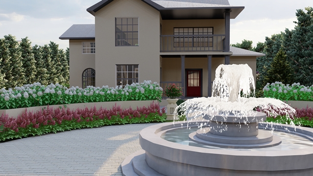 🌿 Организовали круговое движение от въезда к дому и гаражу с доминирующим фонтаном, обрамлённым гортензиями - для торжественного приема;