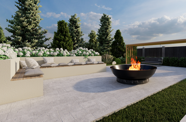 🌿 Создали зону отдыха с террасой, аркой и креслами-коконами, добавили костровую чашу;