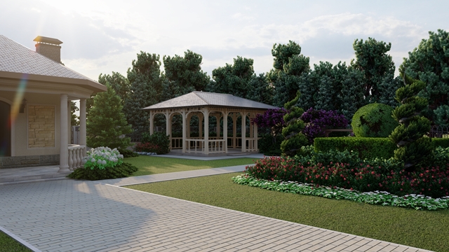 Задача: создать классический строгий ландшафт в регулярном стиле - с порядком, гармонией, парадной въездной зоной, полной приватностью и ностальгическими акцентами.